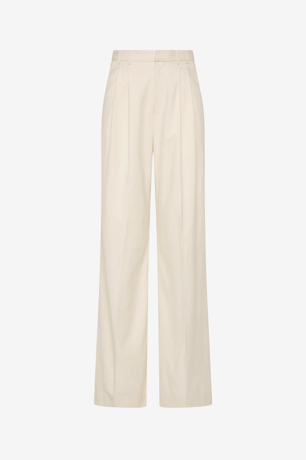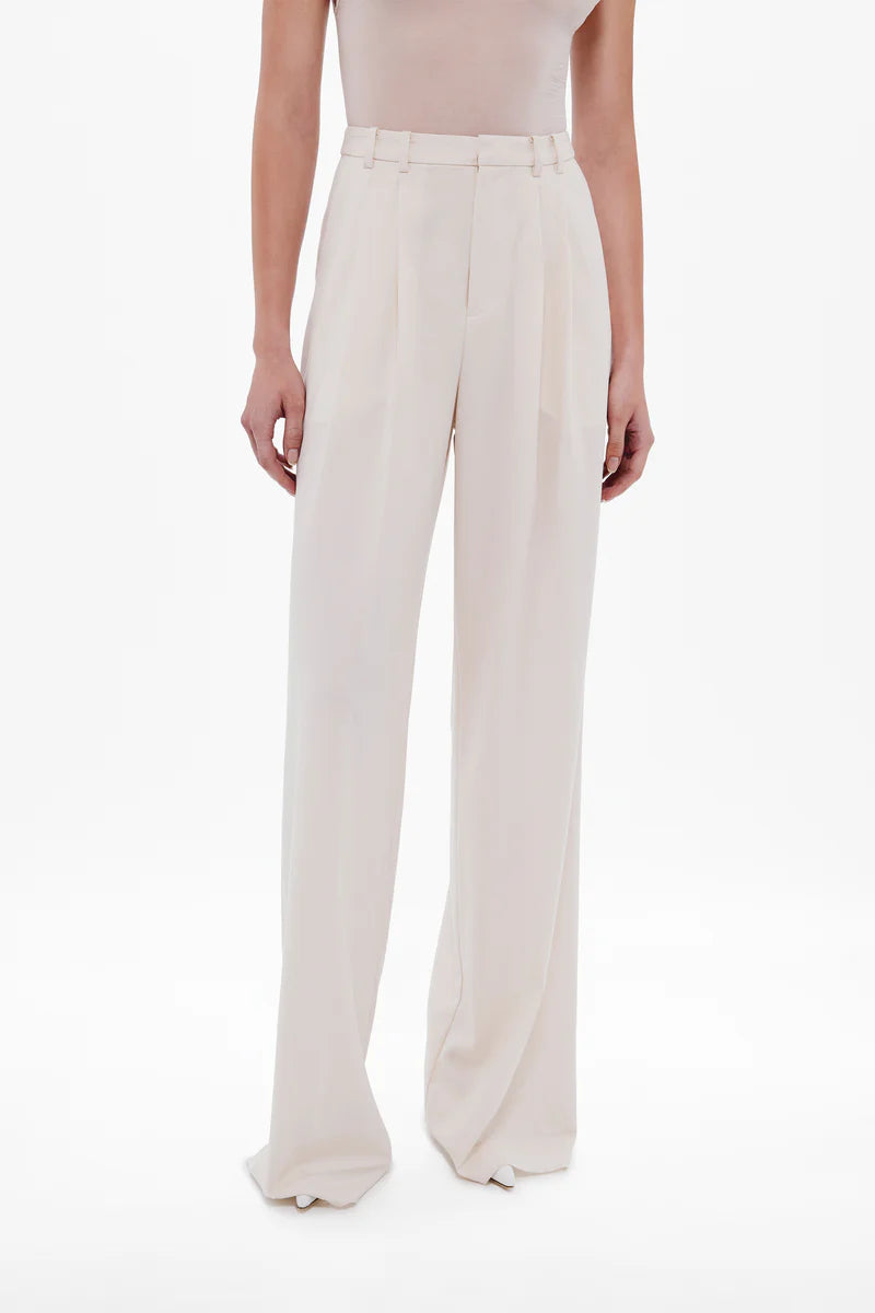 A classic high-rise wide-leg trouser in a premium tencel & wool blend suiting fabrication. Designed with soft front pleats to sculpt the waist and elongate the leg, this style offers a relaxed yet refined silhouette. The clean waistband is finished with five belt loops for versatile styling, while the lightweight drape ensures effortless movement.