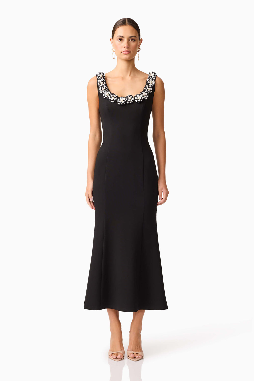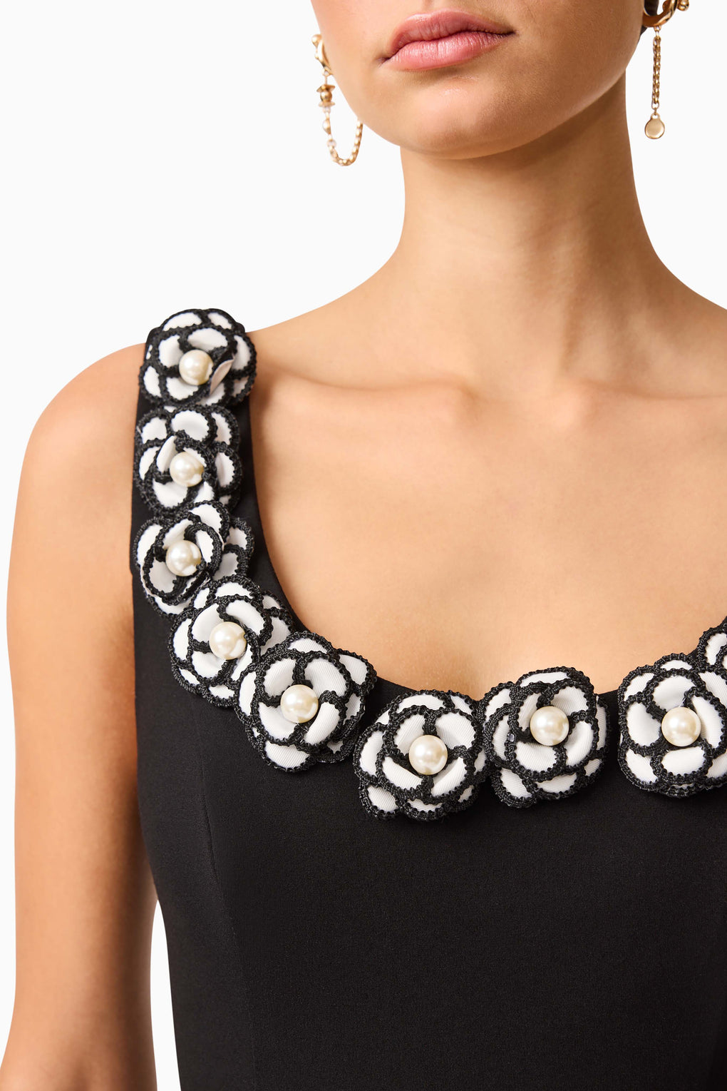 A striking statement piece, the Marina Midi Dress in Black and White is designed to captivate. Featuring a rounded neckline adorned with 3D floral embellishments, this style balances structured elegance with romantic detail.