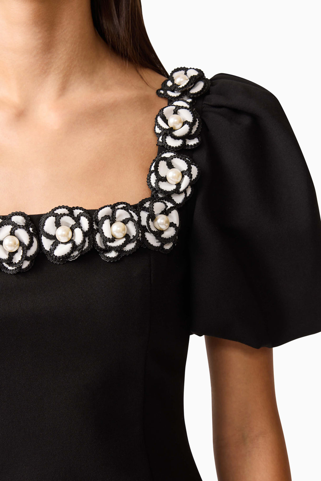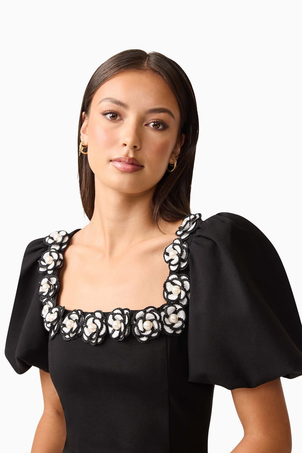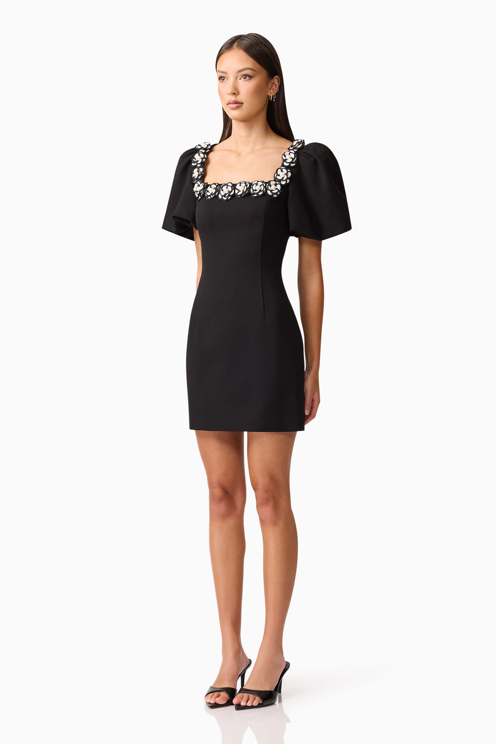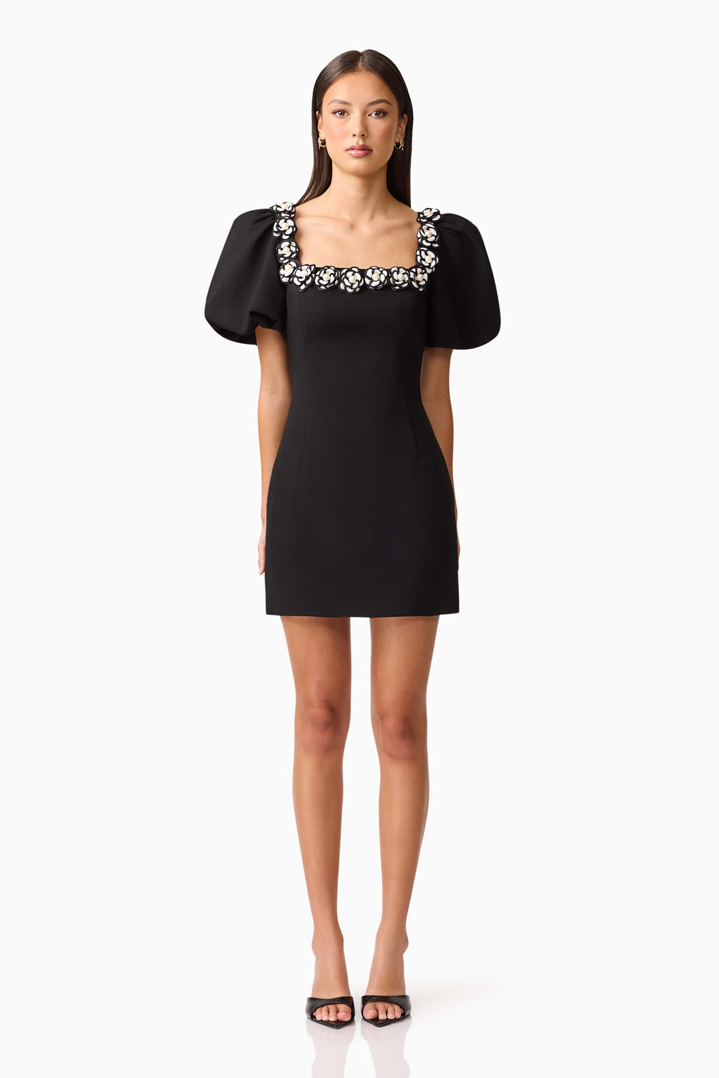 Modern drama meets timeless elegance in the Marina Puff Sleeve Mini Dress. Defined by its voluminous puff sleeves and square neckline, this style is elevated with 3D floral detailing around the neckline for a romantic touch.