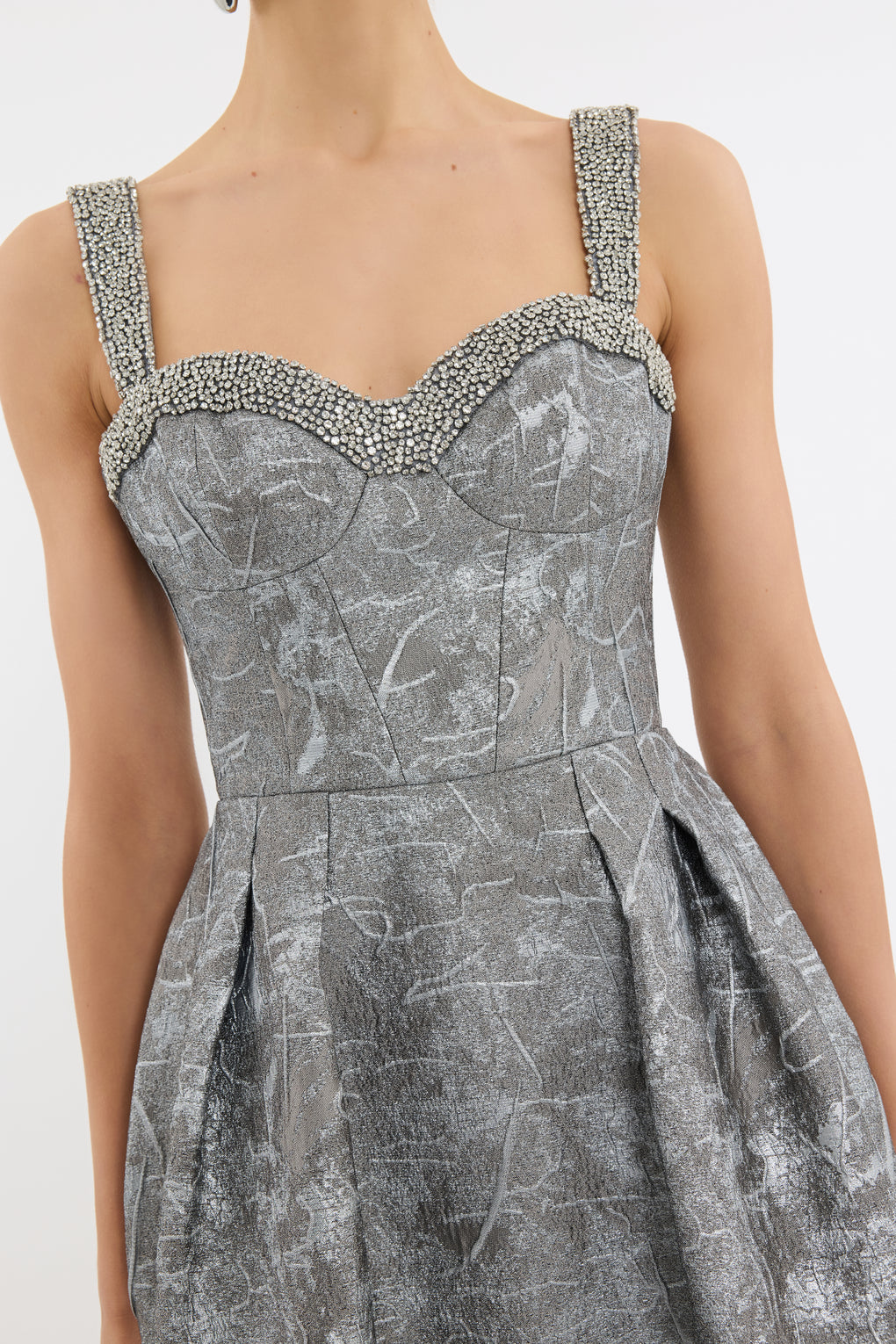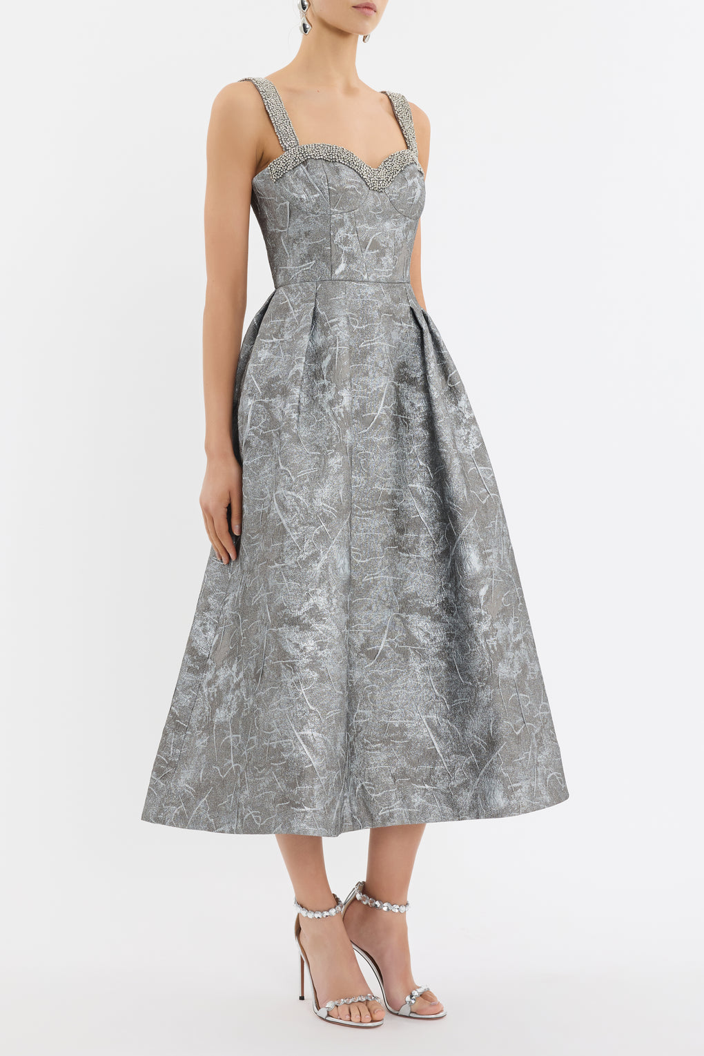 The Sterling Midi Dress in silver is simply eye-catching, adorned with intricate diamante embellishments. Tailored from metallic jacquard, it features a sweetheart neckline and fitted bodice with soft cups to shape a feminine figure, supported by adjustable wide straps. Cinched at the waist, the circular midi skirt offers an elegant silhouette, secured with an invisible zip fastening at the back. Ideal for your next special event, this dress is the perfect choice.