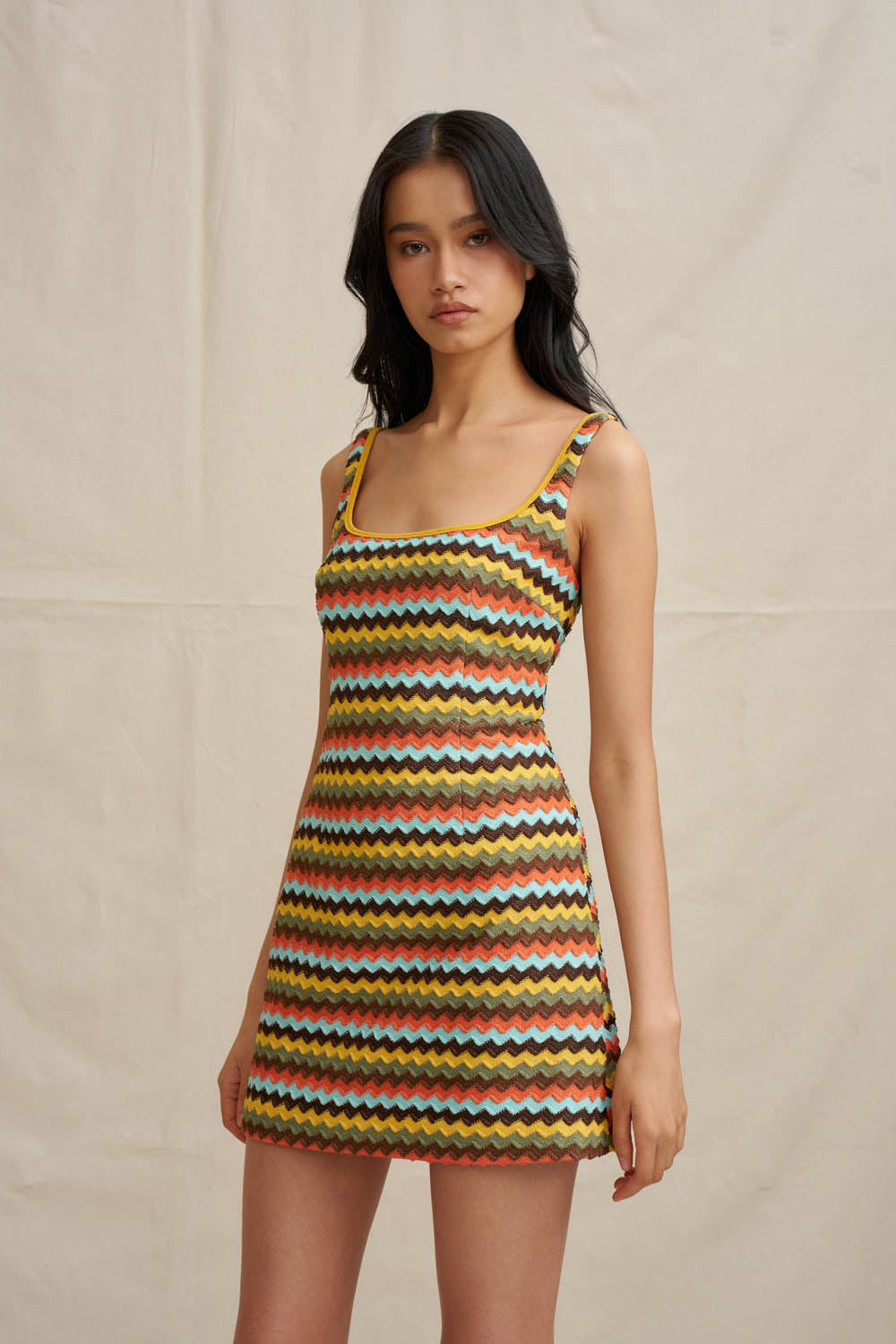 Made from a multicoloured zig zag stripe, textured knit fabrication. Fabric features a bonded layer to create structure and shape.