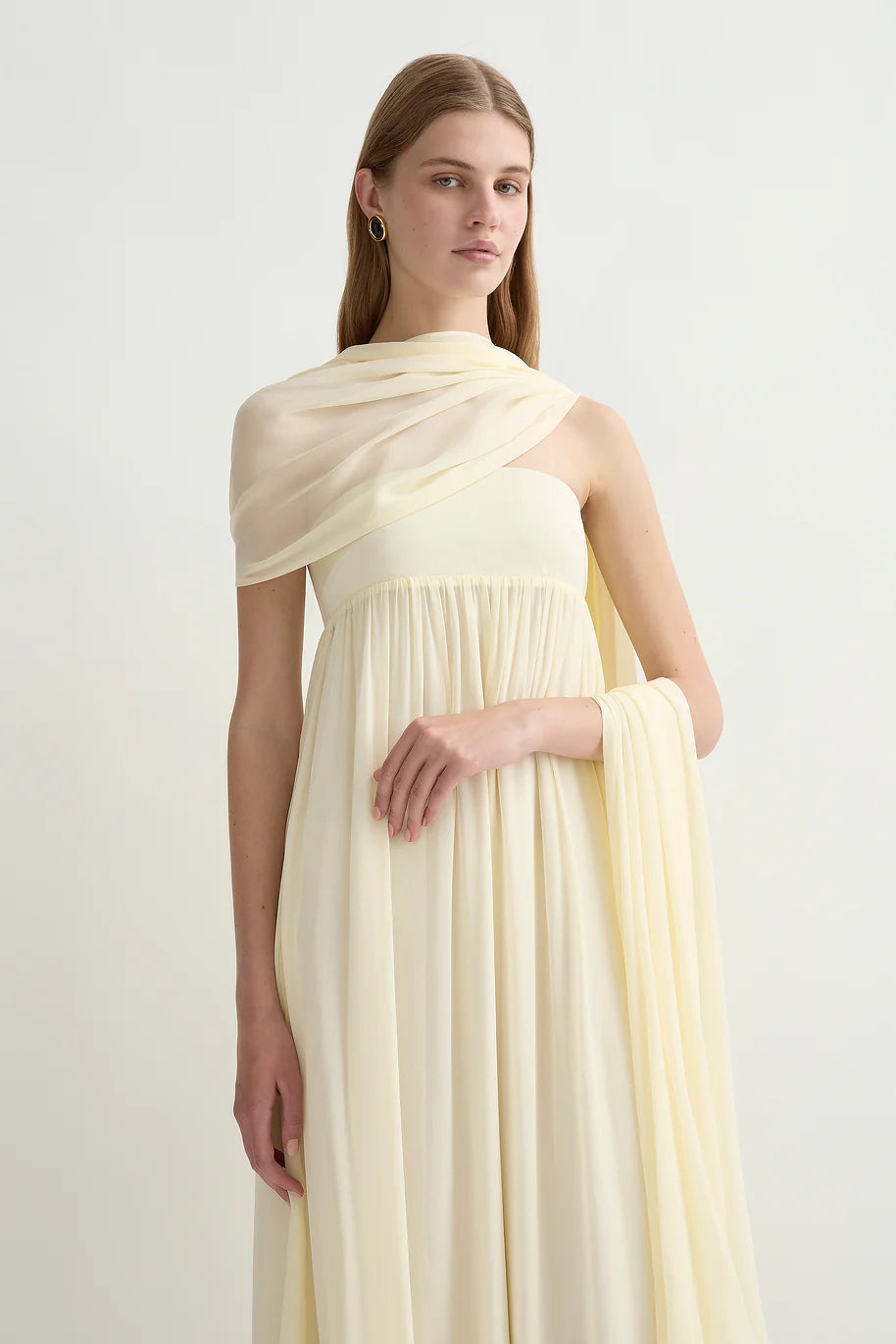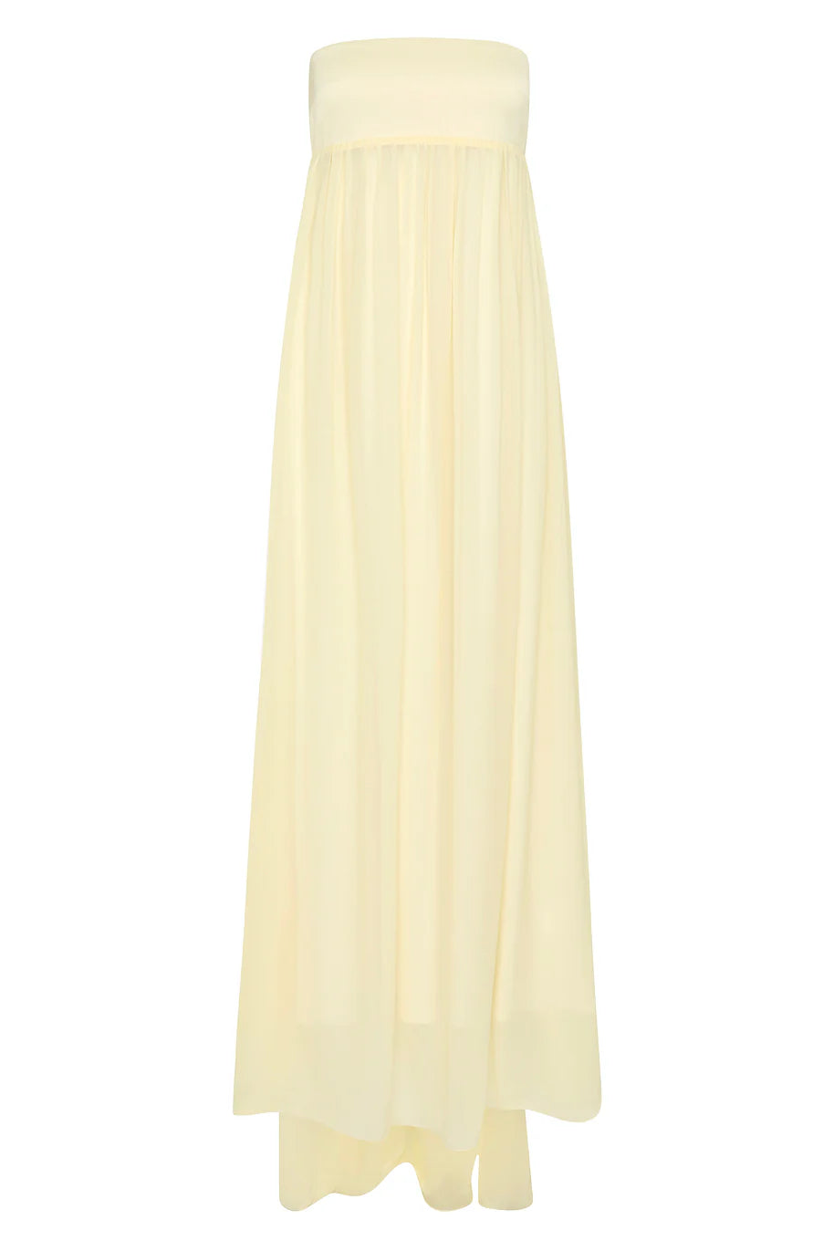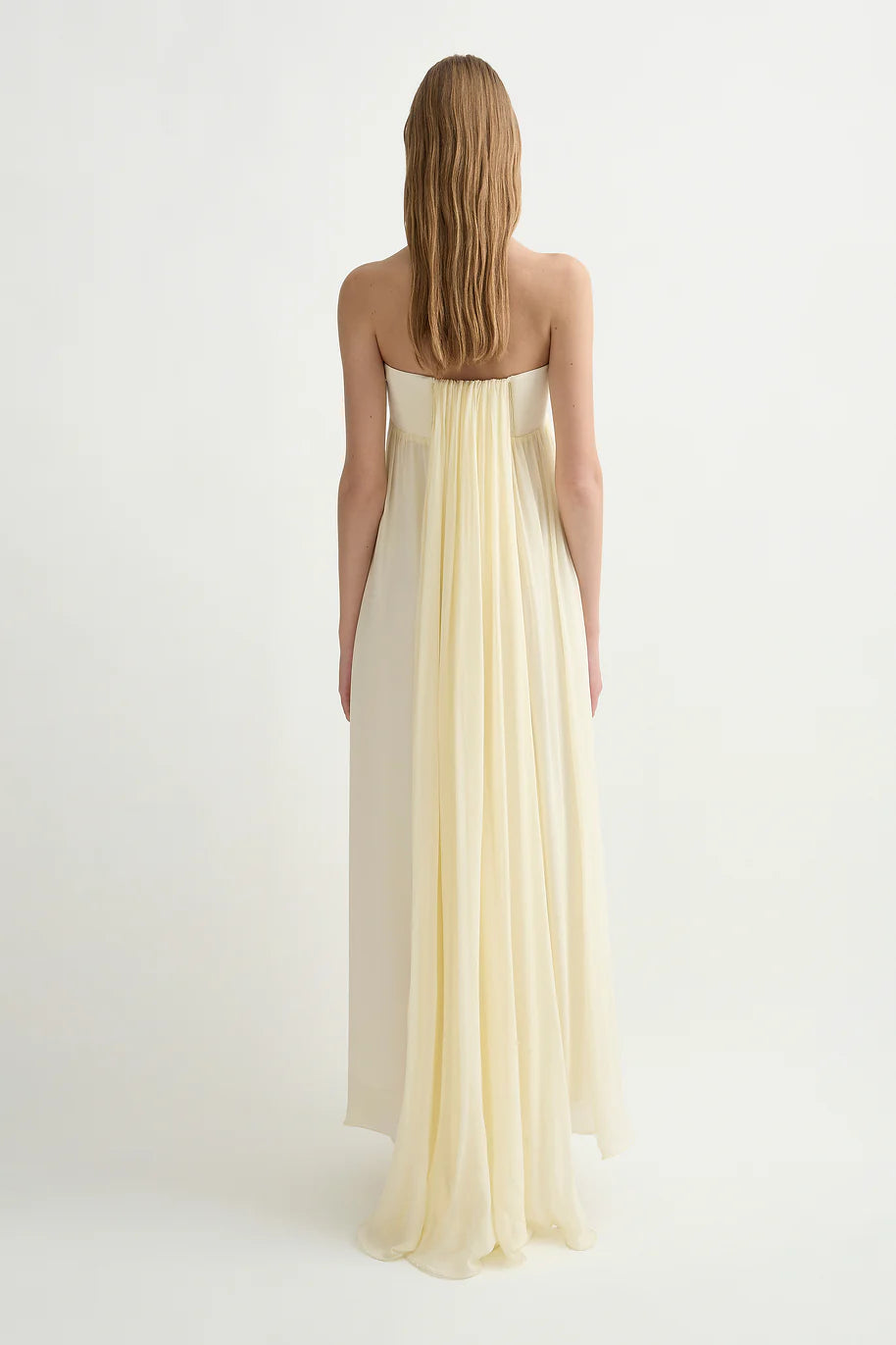 Designed in a strapless silhouette, the Solene Dress features a contrast bodice that falls from the underbust into a full maxi skirt. An elegant train falls from the centre back, allowing multiple styling options.