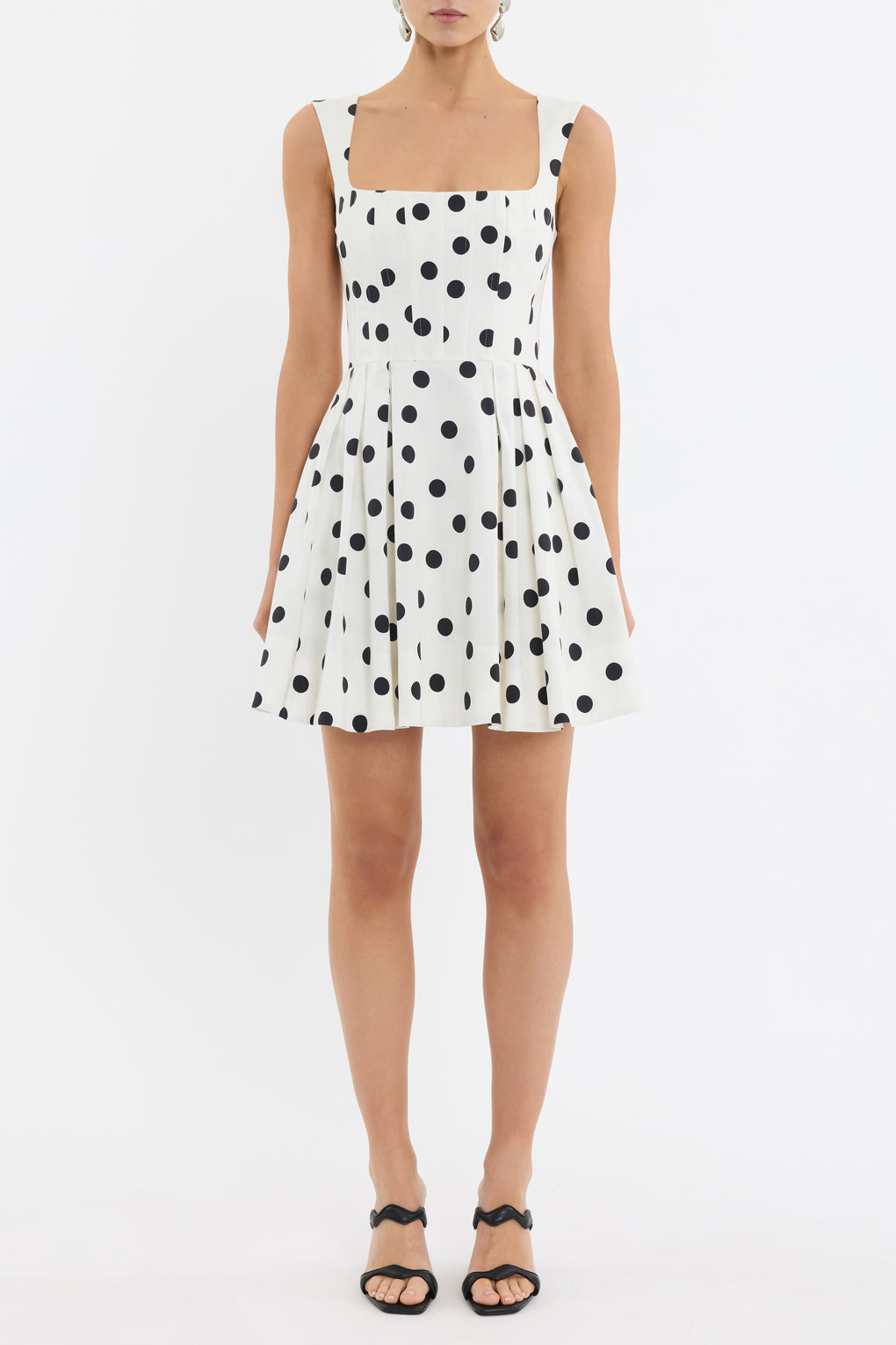 The Maisie Mini Dress exudes chic style, featuring an eye-catching monochrome polka dot print. Its corseted bodice and square neckline shape a feminine silhouette, supported by wide straps for utmost comfort. Cinched at the waist, the circular mini skirt is detailed with side seam pockets for added convenience, while an invisible zip fastening at the back ensures a secure fit. Fully lined, this dress is perfect for both day and evening occasions.Style Number: 2504-1194e fit.