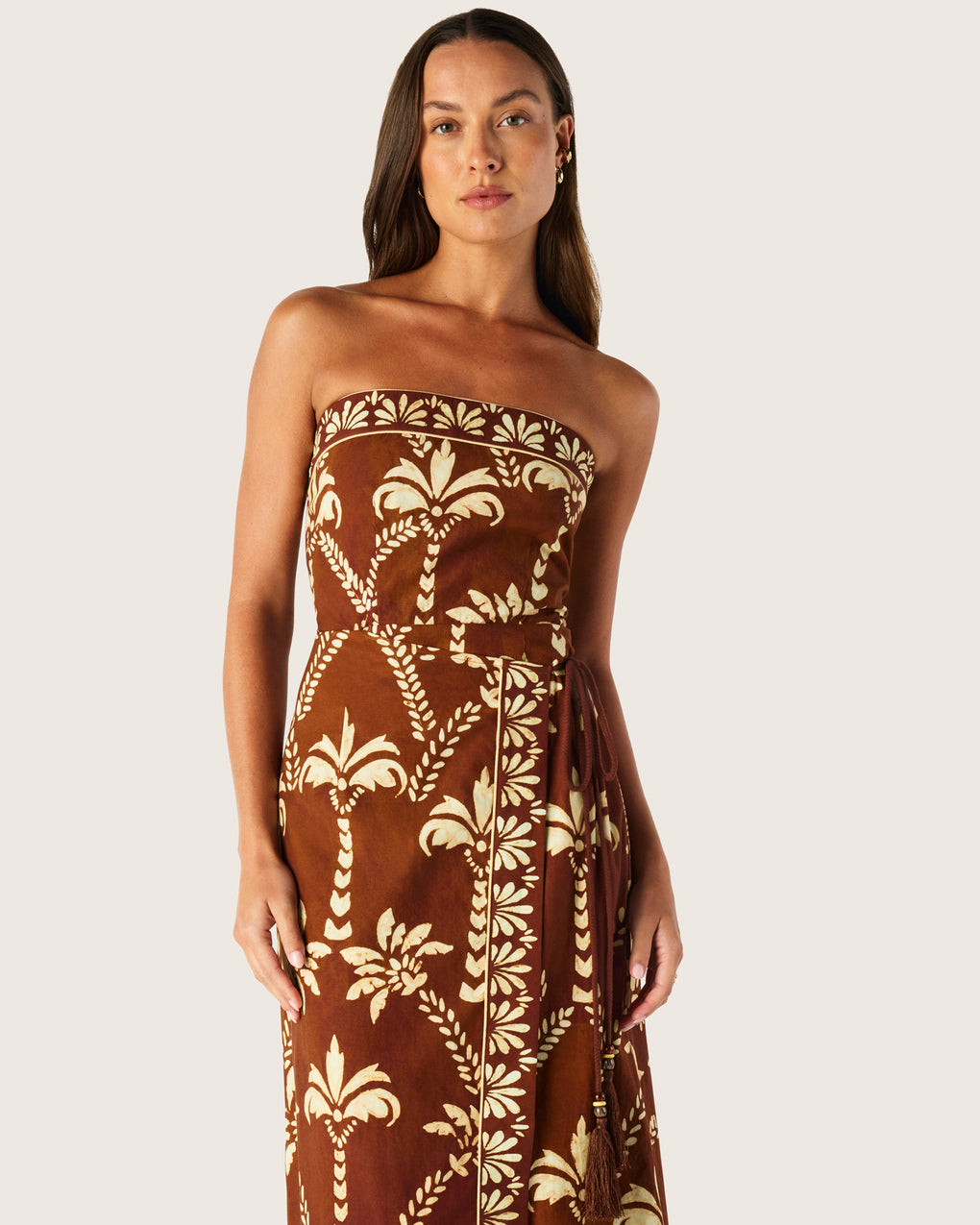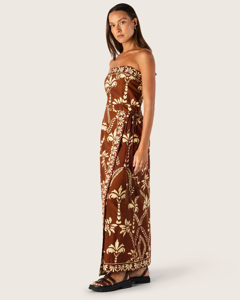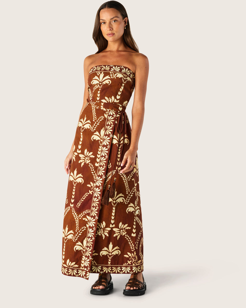 Embrace golden hour in style with the Deia Strapless Dress. This maxi silhouette is cut from a fluid cotton-blend weave in a retro-inspired tropical print. Fitting straight across the bust, this dress features a wrap skirt with tie detail at the waist. Choose boho-chic jewellery and flatform sandals to complete your look.