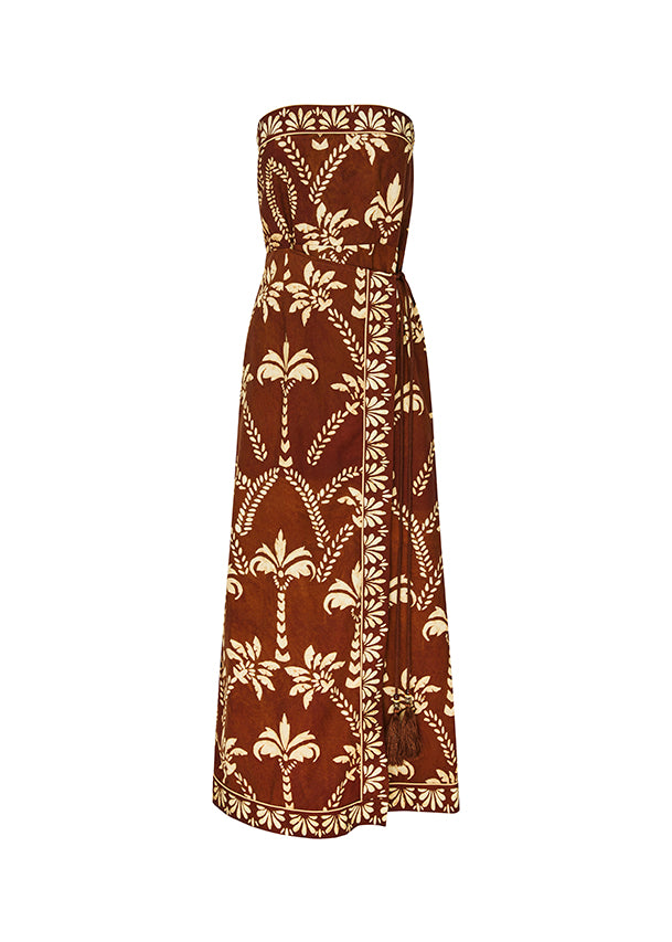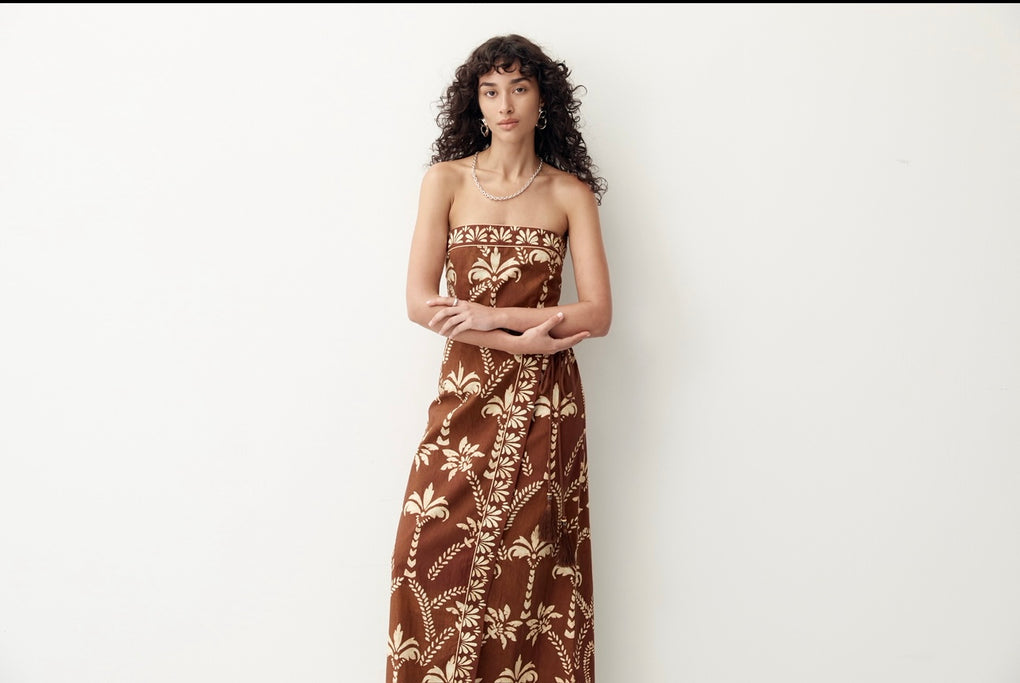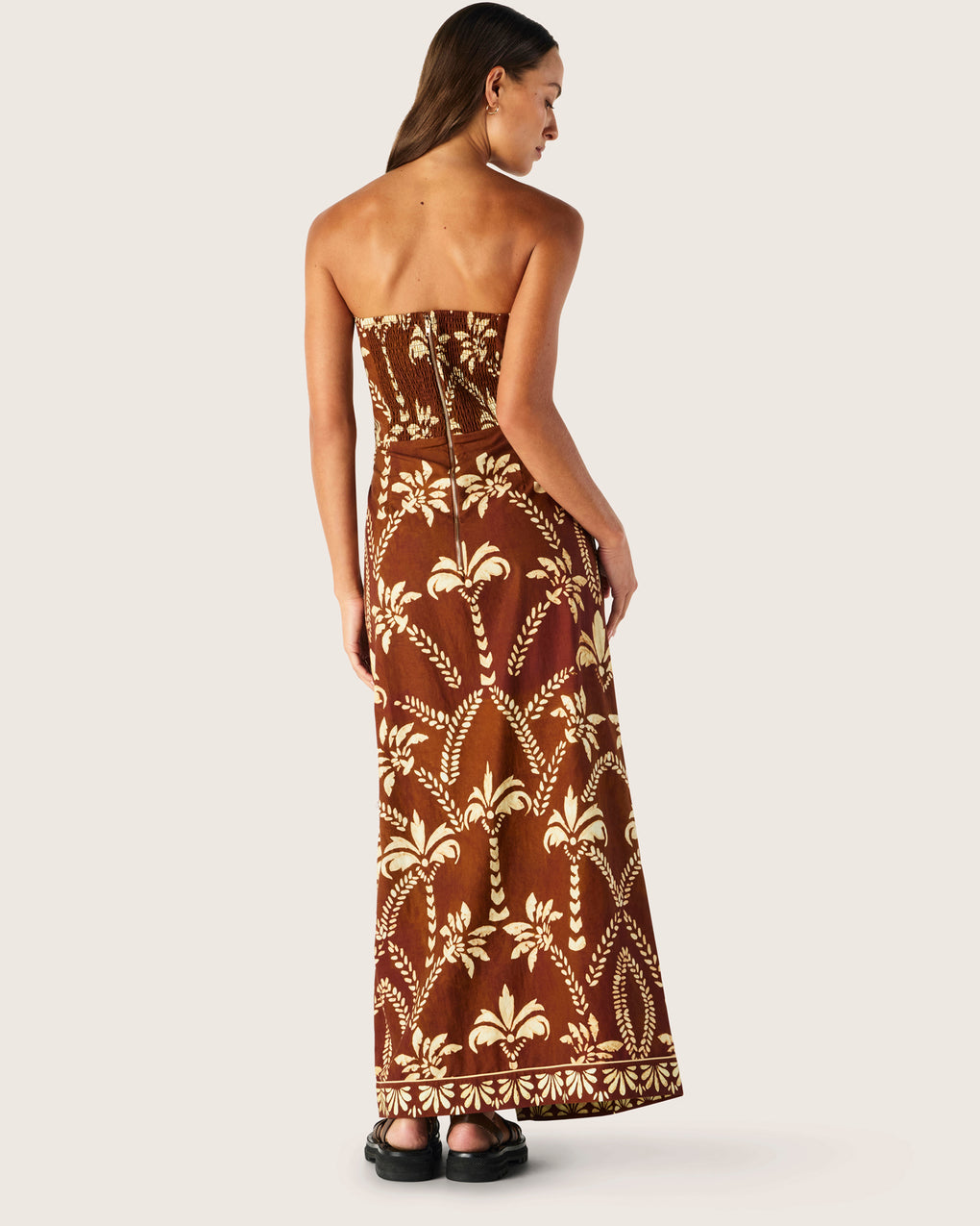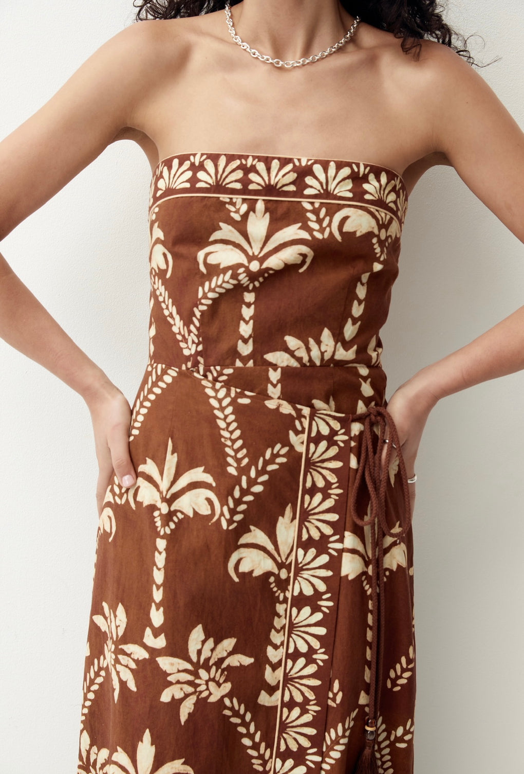 Embrace golden hour in style with the Deia Strapless Dress. This maxi silhouette is cut from a fluid cotton-blend weave in a retro-inspired tropical print. Fitting straight across the bust, this dress features a wrap skirt with tie detail at the waist. Choose boho-chic jewellery and flatform sandals to complete your look.