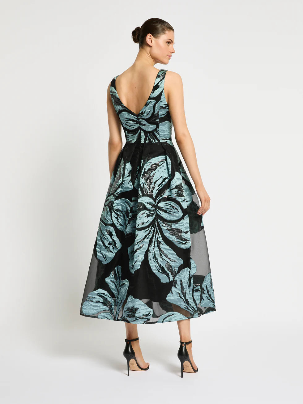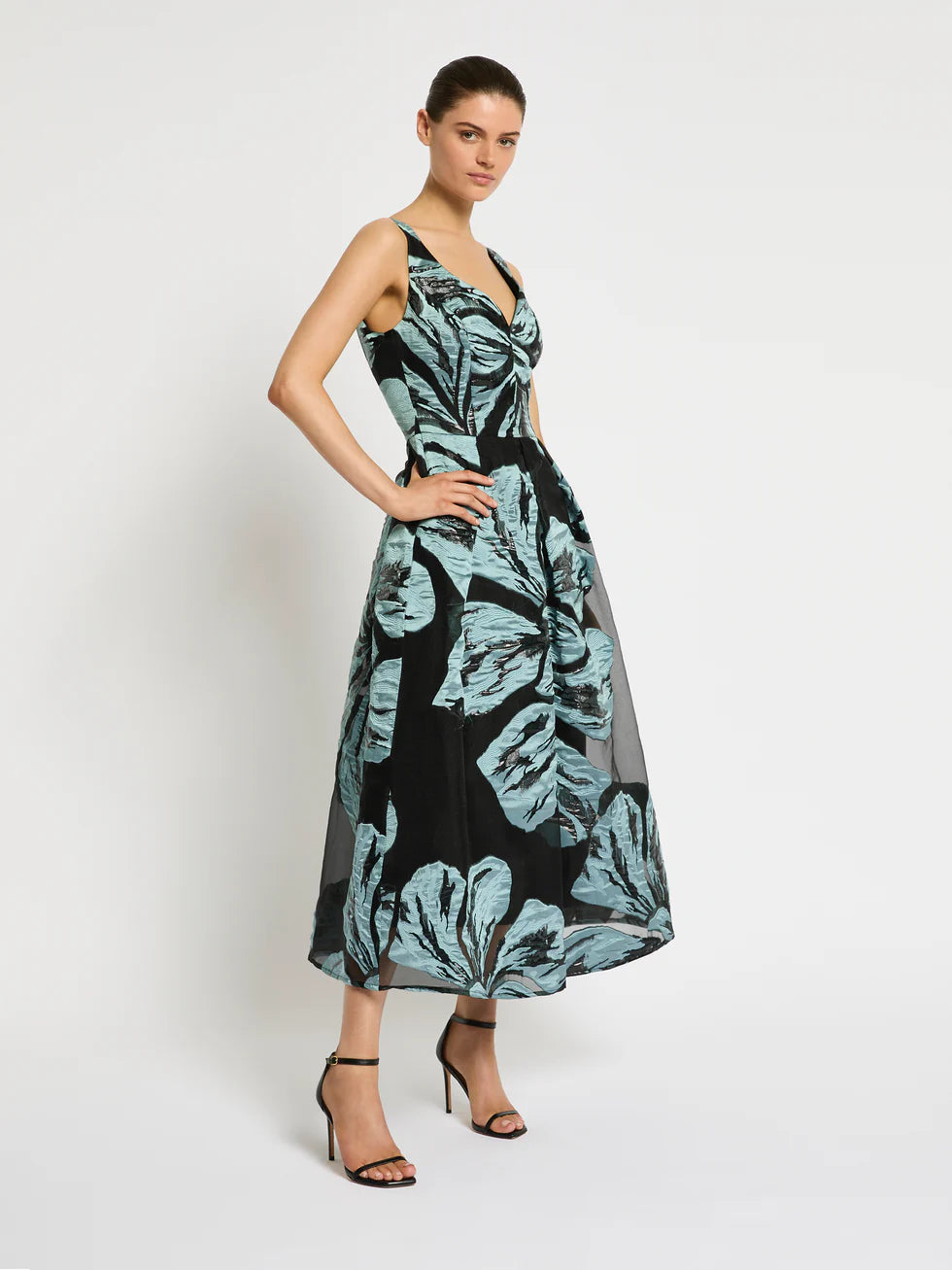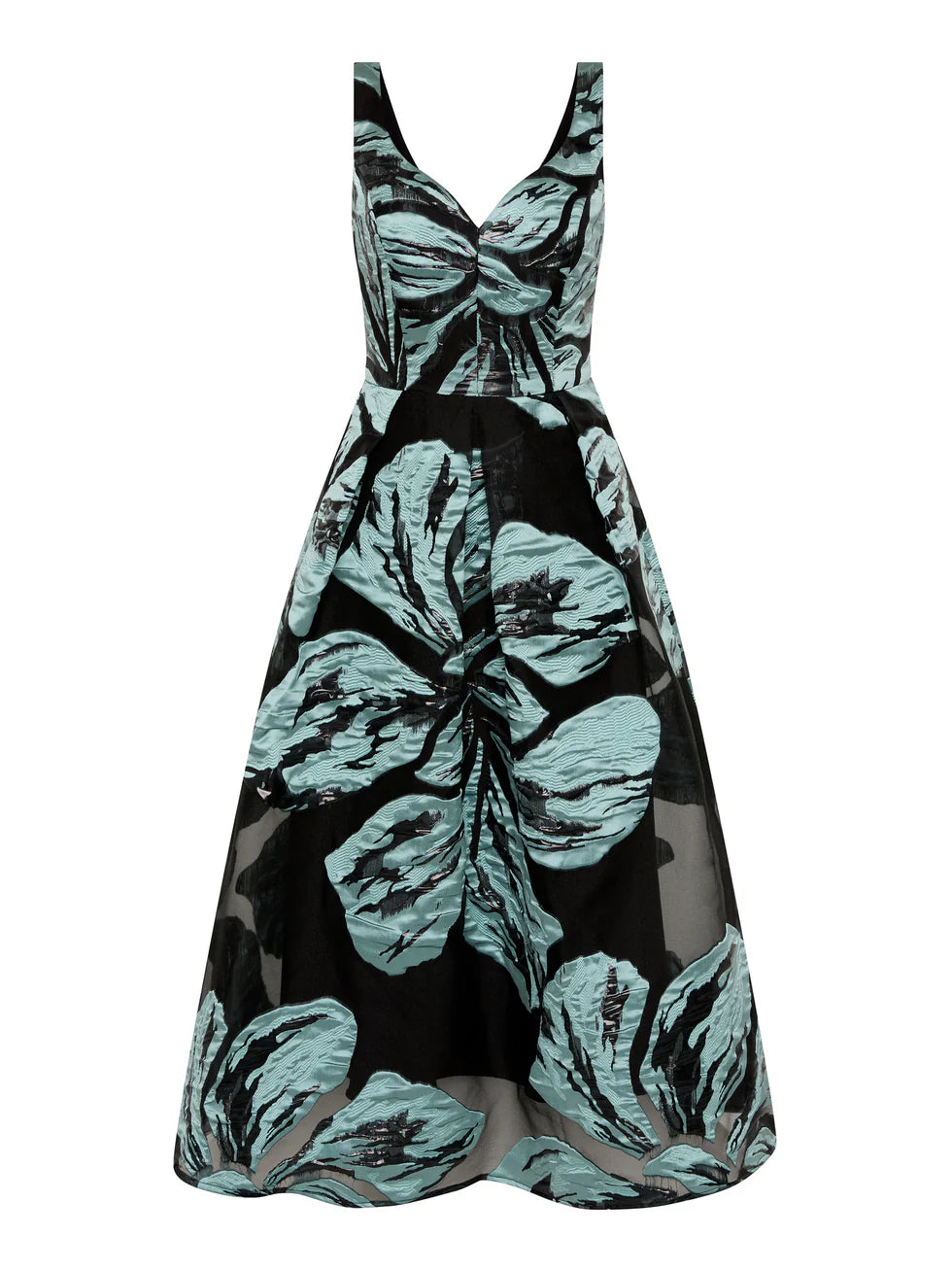 The Bella Midi’s mint blue floral design with metallic highlights is crafted on a contrasting black organza jacquard and is meticulously placed to flatter the body. It features a sweetheart neckline with structured bodice panelling and a waist seam, falling to an A-line skirt and finishing at midi length. This classic A-line silhouette is fully lined with an inverted pleat at centre front. A standout piece for any cocktail or black-tie event.