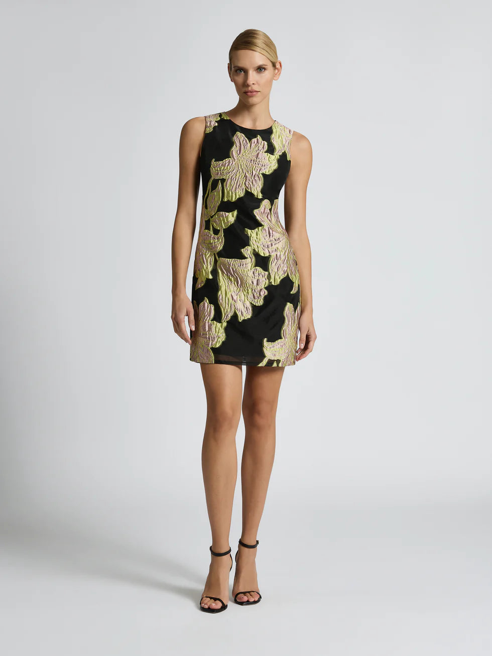 Inspired by vintage 1950’s glamour the Florence Mini is crafted from an exclusive two-tone floral jacquard in citrus and pink on a contrasting black organza. The fully lined classic mini shift is shaped to fit the body with a round neckline and straight skirt finishing above the knee. An easy to wear cocktail or special event showstopper.